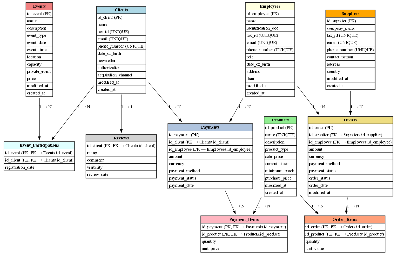 | Employees | Internal, Limited | Access to clients, events, and products (day-to-day tasks) |